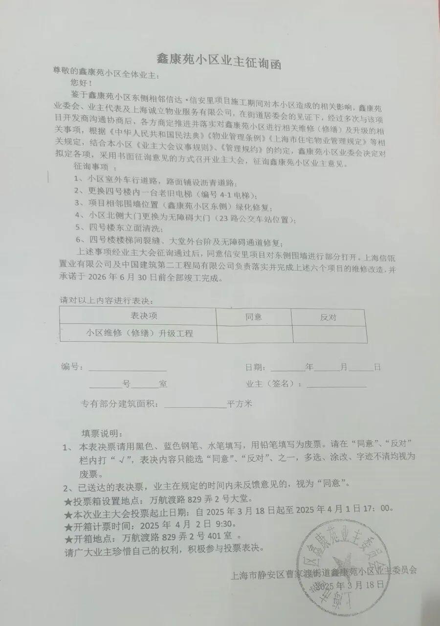 今年3月,鑫康苑发起了一项全体业主征询,起因是旁边的信安里项目施工期间对小区造成了一些影响,拟进行相关维修(修缮)。征询内容包括6项:更换4号楼内一台老旧电梯;4号楼东侧与信安里相邻围墙位置的绿化修复;4号楼东立面清洗;4号楼楼梯间裂缝、大堂外台阶及无障碍通道修复等。